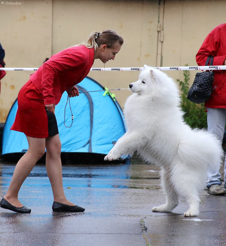 У нас в прошлом году была монопородка (однако) и всероссийка, и впервые ринги самоедов проводили на улице, но не как у вас на асфальте, а на траве. И именно в этот день дождь лил просто проливной. Самое страшное было то, что трава ужасно скользкая и все хендлеры боялись упасть(((((
