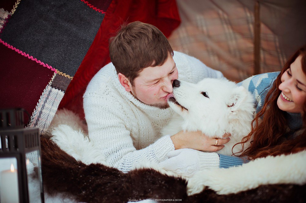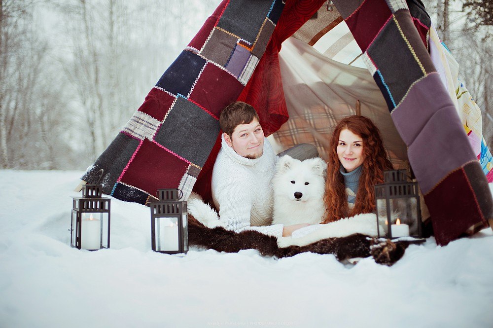 Была у нас тут перед НГ фотосессия, пёс еще мелкий такой...но симпатишный Строили прям такой нормальный вигвам и, что удивительно, в -25 в нем оказалось тепло. Я беспокоилась, что собаку туда будет не затащить, но оказалось, что пёс воспринял его, как дом родной. Зашел и лег на шкуры, и лежал фиг подвинешь - инстинкты, понимаешь