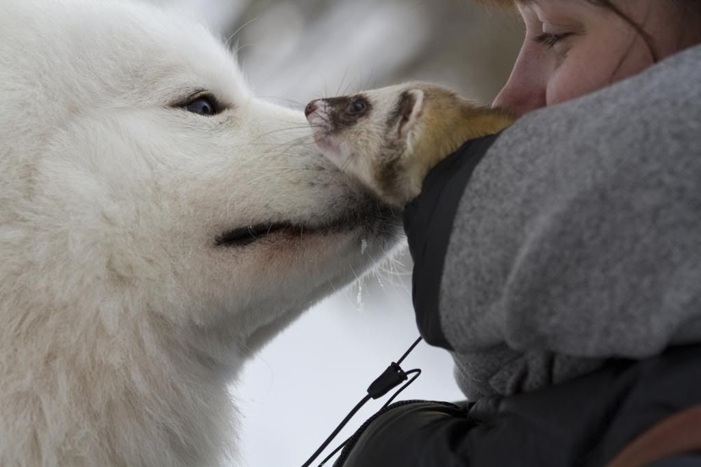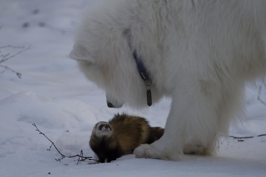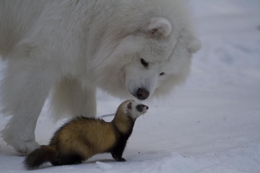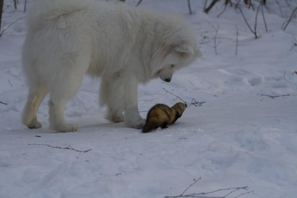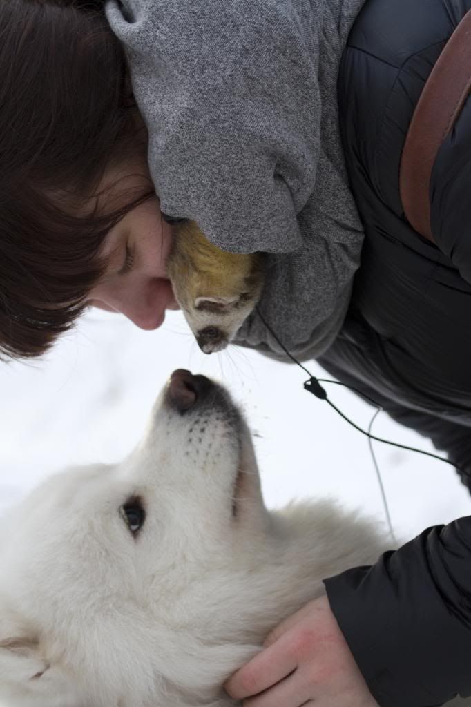 В процессе общения, хорьку стало холодно и он решил погреться, взбираясь вверх по мохнатой самоедской ноге вглубь шерсти, туда, где так тепло и мягко