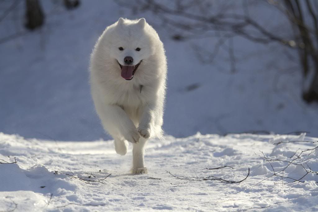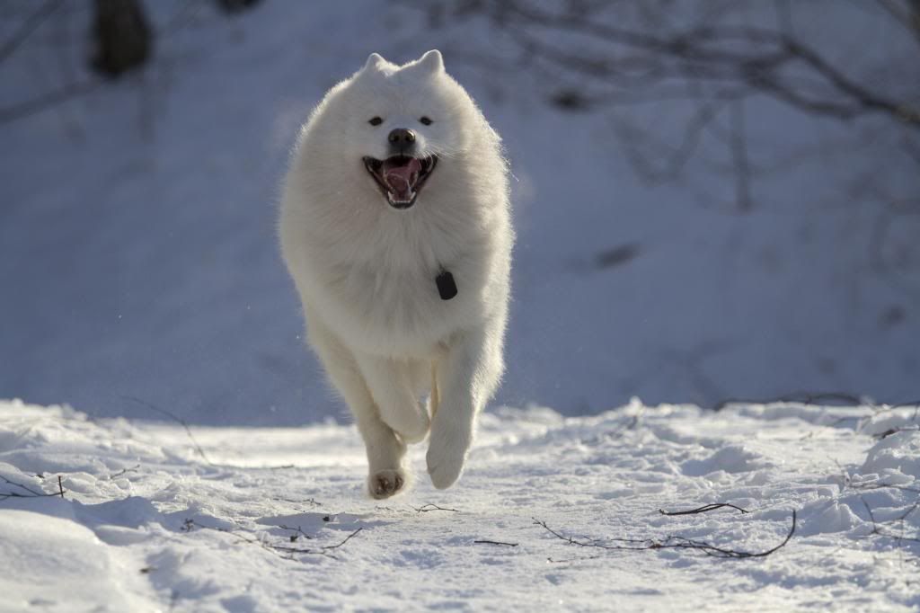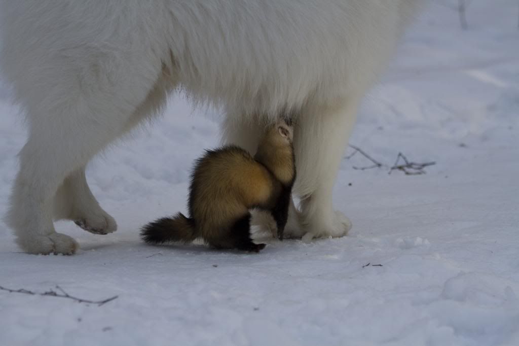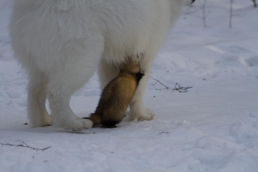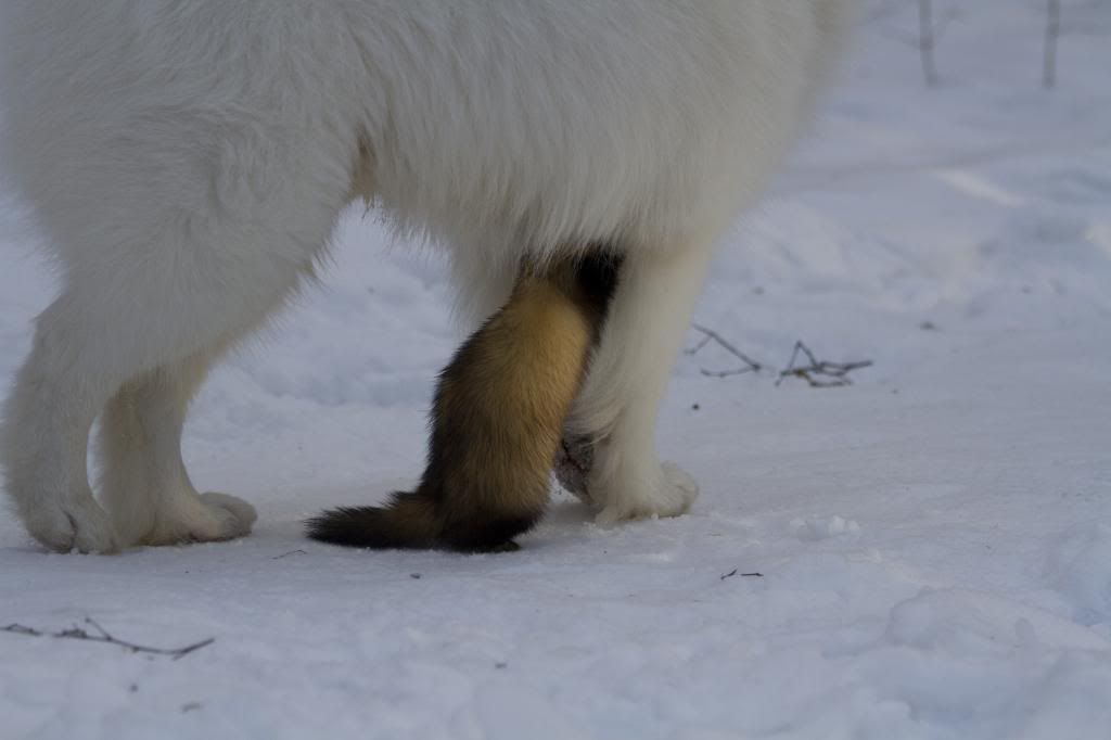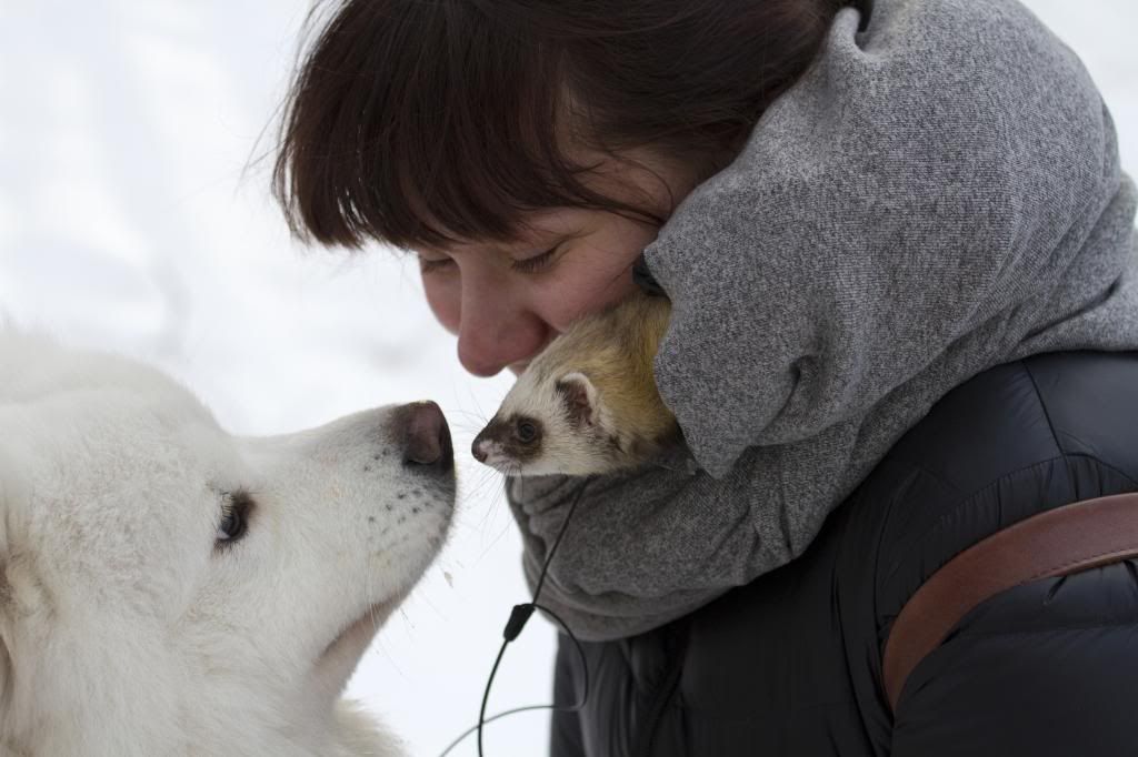 В процессе общения, хорьку стало холодно и он решил погреться, взбираясь вверх по мохнатой самоедской ноге вглубь шерсти, туда, где так тепло и мягко