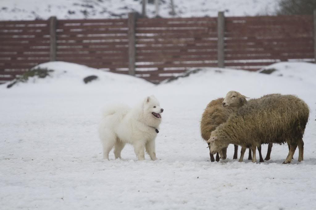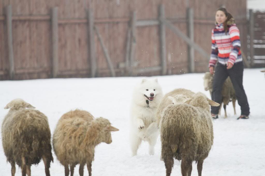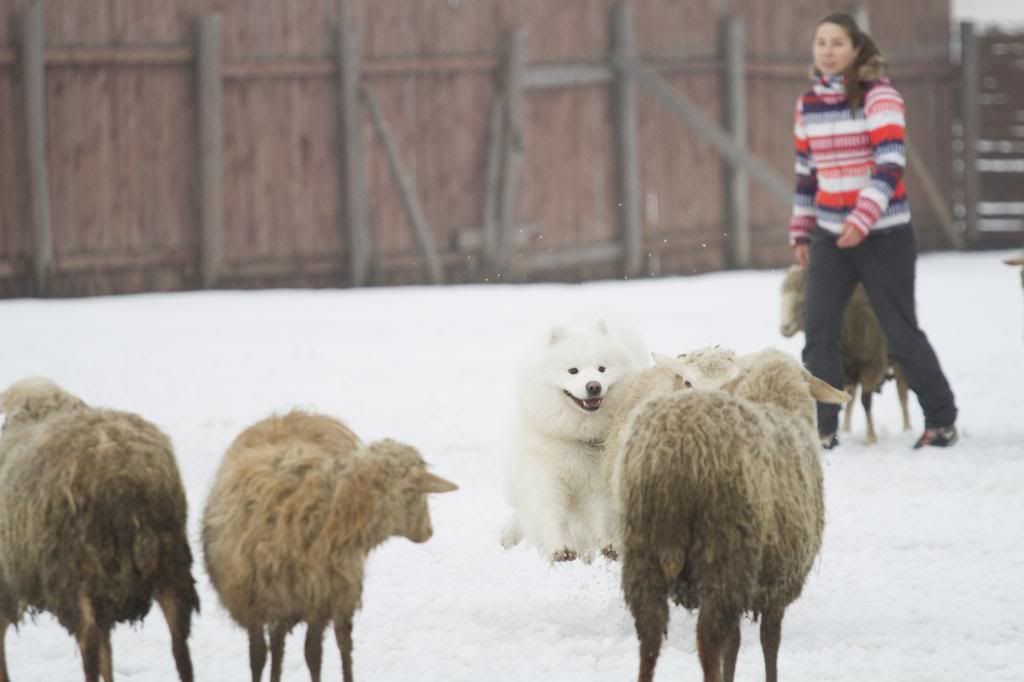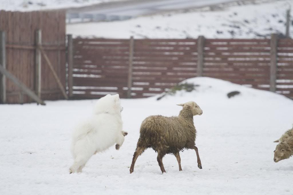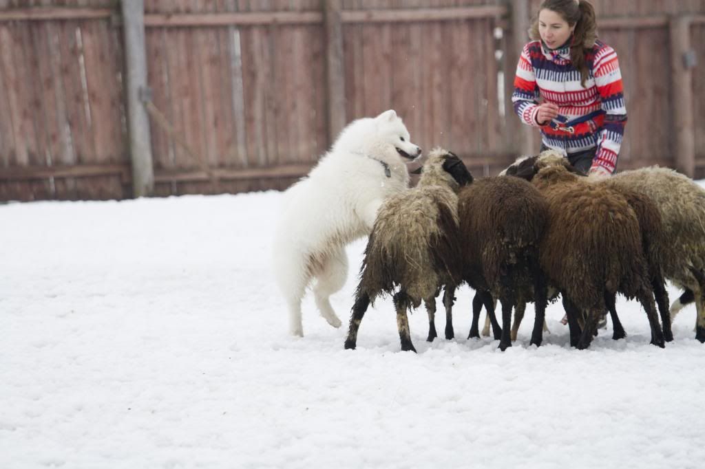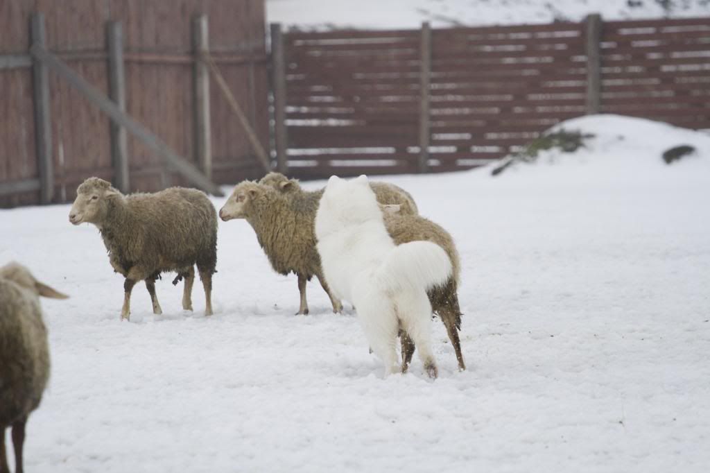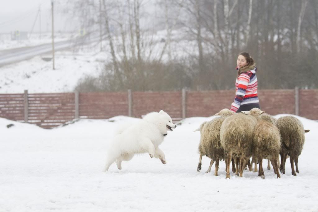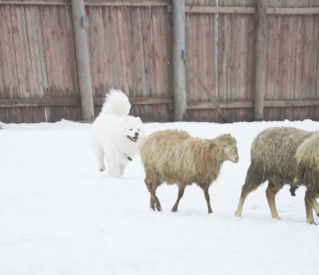Как здорово! Такие интересные фотографии... (овцы правда грязноваты, но тем роскошнее белоснежный Тао на их фоне). Тао так весел и счастлив... так и летает вокруг овечек