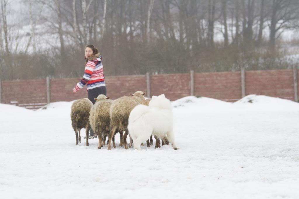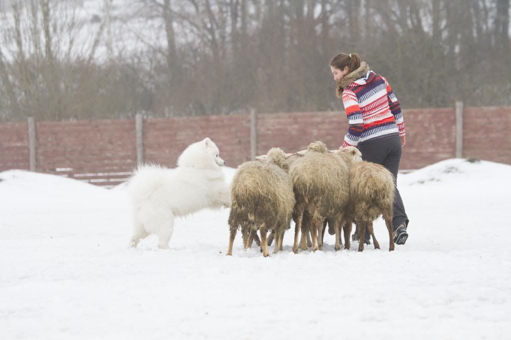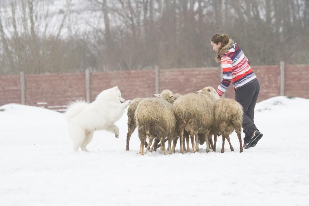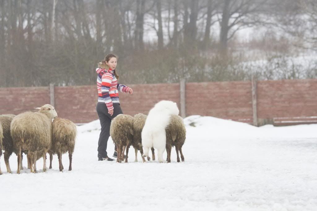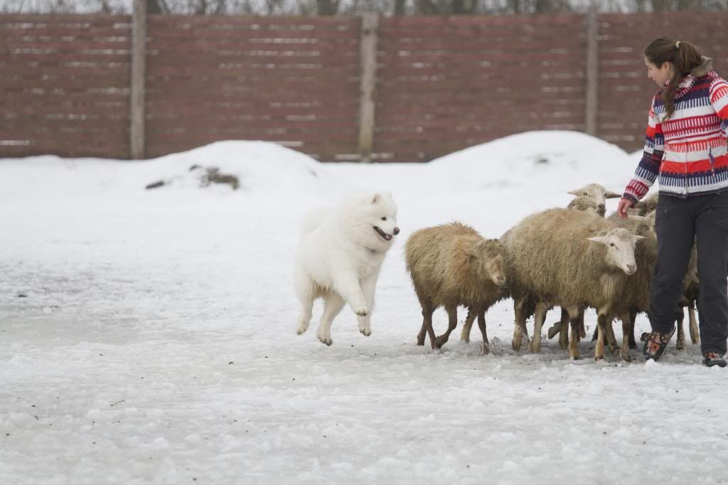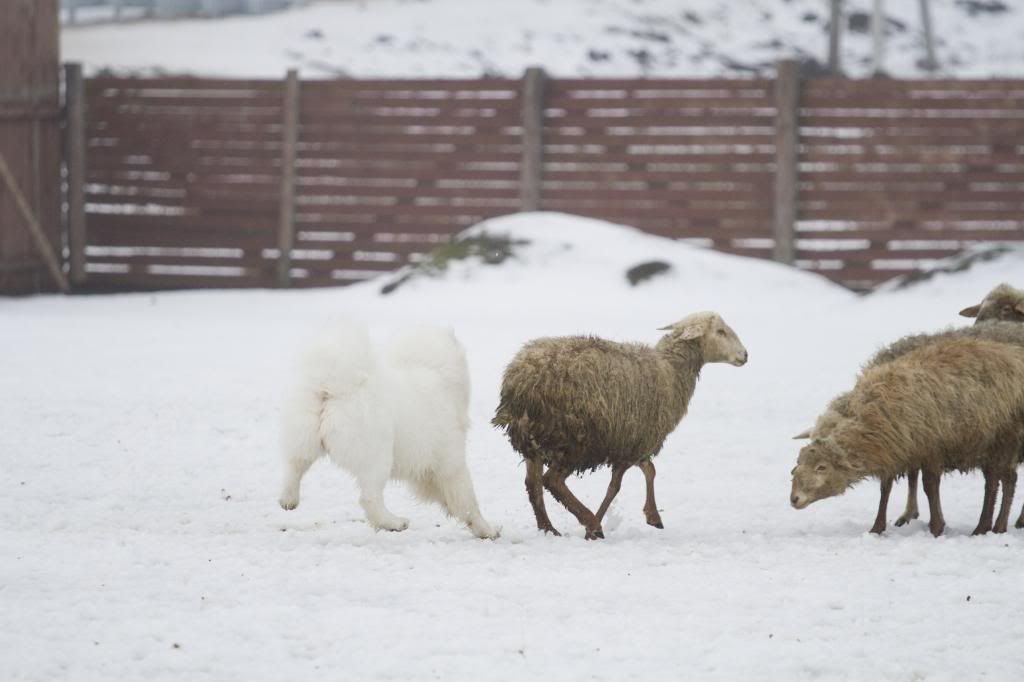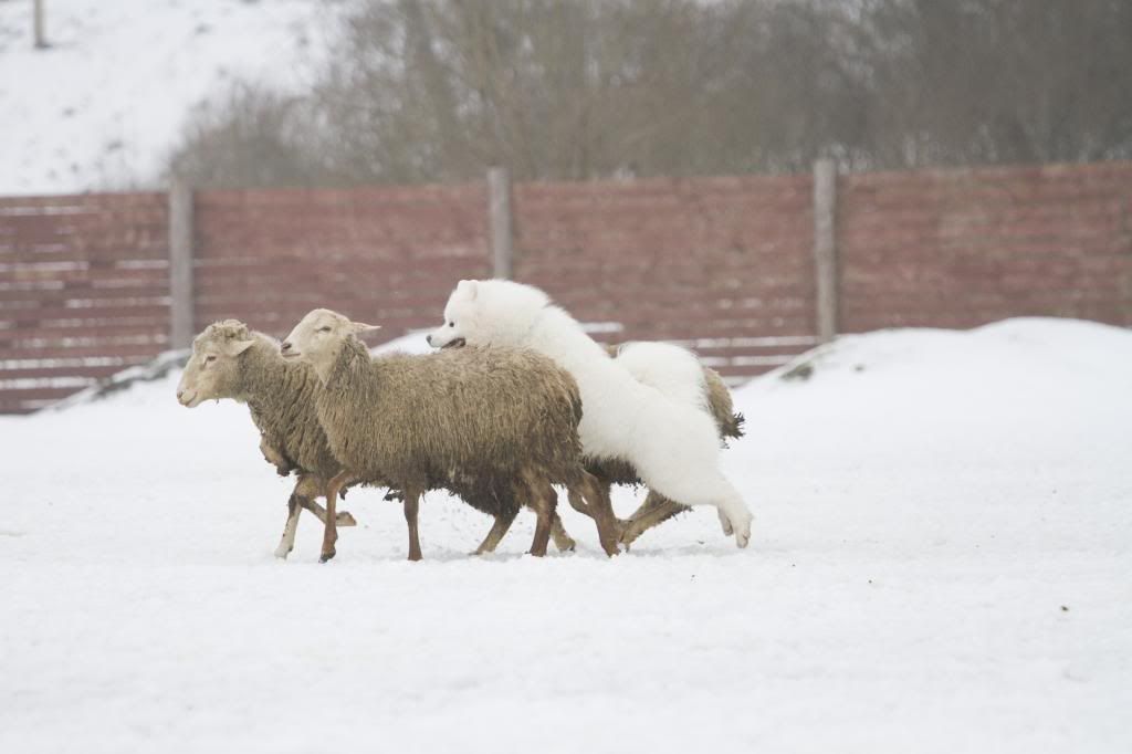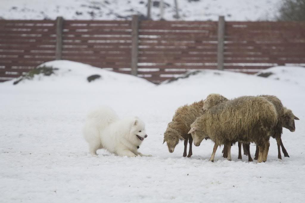 Как здорово! Такие интересные фотографии... (овцы правда грязноваты, но тем роскошнее белоснежный Тао на их фоне). Тао так весел и счастлив... так и летает вокруг овечек