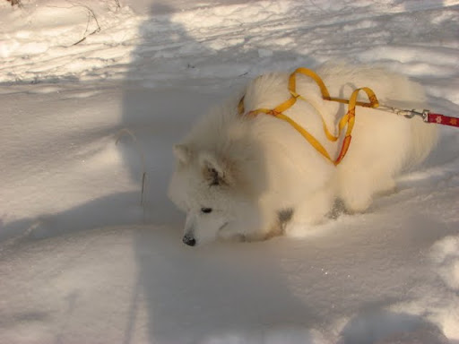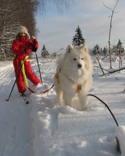 | Omolon, шлейка от Рената Хабибулина. http://www.renata-sleddog.ru/opisanie.html Мы долго выбирали, но как-то мне его шлейки понравились: и отзывы хорошие и сам дядечка очень приятный. Ездили к нему в Люберцы - он сам все подобрал, показал, как приучать, сказал, звонить, не стесняться, если вопросы будут... enot-lana, мы довольны. Вроде одни сплошные плюсы. Немножко хвост путается - если Алтай ныряет в сторону, например - приходится поправлять. Зато можно и лыжника буксировать и покрышку таскать, и санки - это универсальный вариант, удлиненный. Есть специальный для лыжника, там шлейка кончается на спине, до хвоста, а не после - Ренат этот вариант для соревнований рекомендует. А если по выходным на лыжах, да детей катать - лучше удлиненную, как у нас. gelka, У Светки пояс почти на самый минимум затянут. Нормально так, ей удобно. Я тоже не туго затягиваю. А шлейку такую нам Ренат посоветовал (см. выше), ну и на сайте его так написано. Мне кажется, если только на лыжах кататься, то короткий вариант удобнее - хвост не будет путаться. А Алтаха чаще все-таки на Шамана похож, мне кажется (ну и на Маркуса, соответственно). Такой плюшевый, как на последней фотке, он редко бывает.